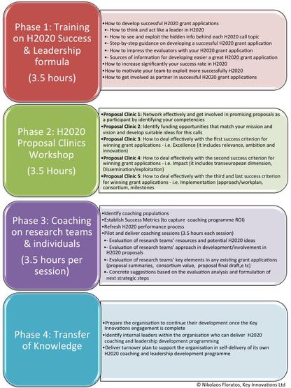 Our Horizon 2020 coaching programme offers the full range of support that any organisation needs in order to excel in Horizon 2020.  It is perfect for research organisations who wish to exploit Horizon 2020 effectively and develop or get involved in successful Horizon 2020 grant applications with high expected impact for them but also for the society and the industries they are involved. We rely upon a proven coaching method for partnering with clients effectively.  Unlike all other training and support actors in Horizon 2020 that deliver Horizon 2020 training sessions on standard and general issues, we dig deep and we offer one of the best training and coaching experiences for excelling in Horizon 2020 based on concrete steps and guidance.